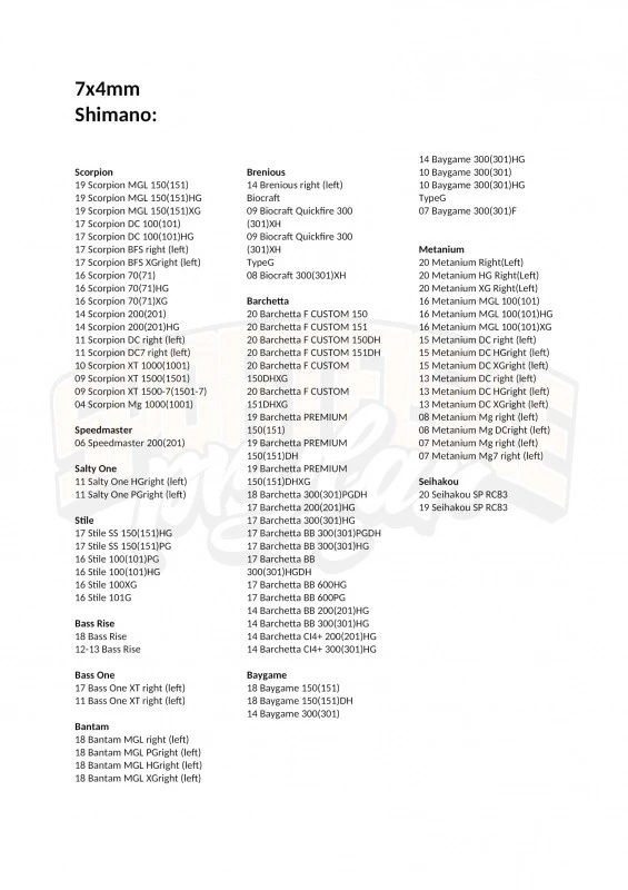 | Größe | Daiwa, Abu Garcia, Quantum, Shimano (8x5mm), Daiwa. Abu Garcia. Quantum. Shimano (8x5mm), Shimano, 13 Fishing (7x4mm), Shimano. 13 Fishing (7x4mm) |