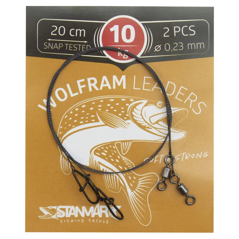 Diese Stan-Mar Vorfächer bestehen aus einer großen Anzahl von sehr dünnen Wolframfäden, die sorgfältig verzwirnt und perfekt verarbeitet sind. Wirbel und Stift sind vollständig in das Vorfach integriert. Aufgrund ihres geringen Durchmessers sind Vorfächer aus Tungsten für die Fische auch weniger sichtbar. Außerdem knicken Vorfächer aus Tungsten nicht ab und verformen sich nicht. Und sollte dies doch einmal passieren, lassen sich die Knicke durch kurzes Erhitzen des Vorfachs, zum Beispiel mit einem Feuerzeug, leicht entfernen. Das Vorfach springt dann wieder in Form. Das Material schadet nicht! Tungsten-Vorfächer sind ideal für Hecht, Barsch, Zander und alle anderen Fische mit scharfen Zähnen.Länge: 15, 20, 25, 35 und 45 cmRollende Wirbel: 8Fastlock-Schnapper: 0